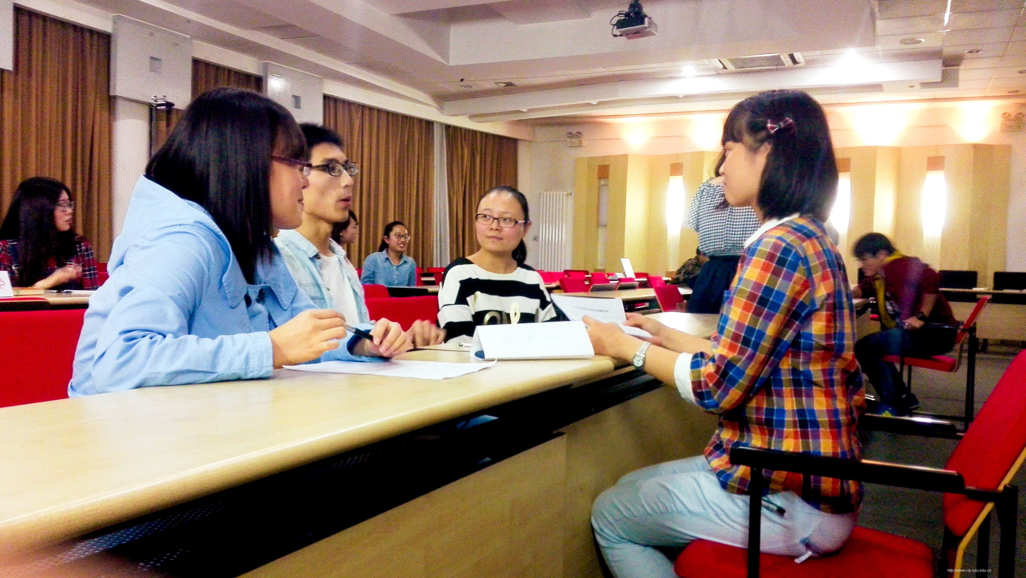 19点30分,面试正式开始。首先是面试者简单的自我介绍,从家乡、性格、爱好,到工作能力和对大学的规划,新生们暂时忘却了军训的疲惫,尽全力把自己介绍给部长们。当被问及想要加入秘书处的理由时,来自青岛的 管璇自信大方地回答道:“我在中学就担任学生会秘书长,所以对秘书处特别有感情。”此外,最具学院特色的学生会国际事务部迎来了13位面试者,这是当天面试人数最多的部门。“如果你有急事要联系一位外国友人,发短信、打电话都联系不上他/她,你会怎么做呢?”问题一抛出,有些同学自信沉稳地从容应答,思路清晰,运用发散思维阐述自己的观点,也有些同学比较害羞内敛,但其希望在学生会工作中锻炼语言表达能力、逻辑思维能力的真诚愿景也赢得了部长们的好感。相比其他部门,参加传媒部的面试者不是很多,但每个来传媒部面试的同学们都做好了充分的心理准备,当被问及是否掌握Photoshop的技能时,他们积极表示愿意学习,其踏实、认真、笃定的精神令部长们十分欣喜。随后,各部门抢人才大战拉开帷幕,部长们一改往日儒雅绅士和矜持淑女形象,为夺得优秀人才展开激烈争辩,场面十分热烈。