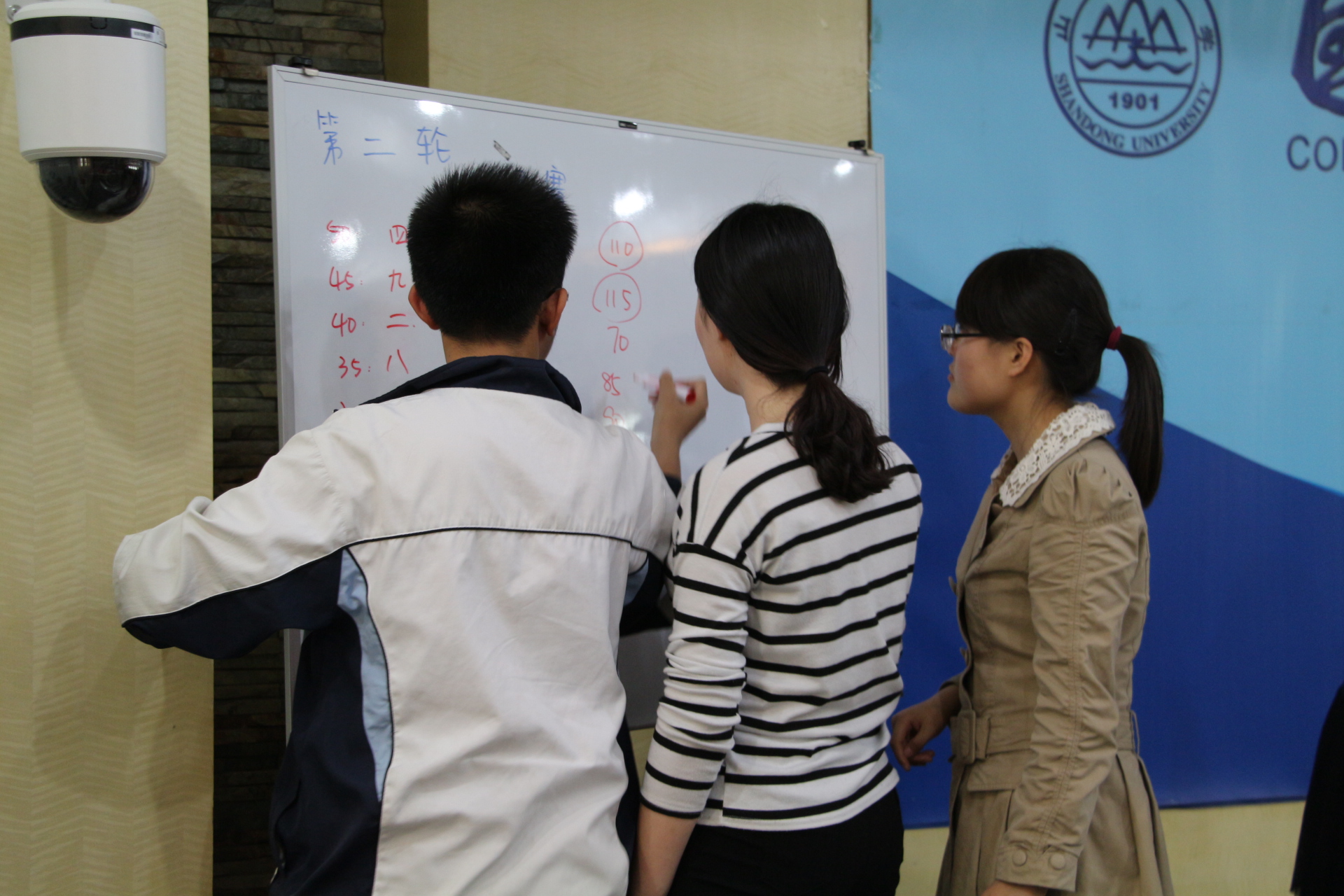 第三轮的团队晋级赛不仅考验选手的知识储备,更是考验团队作战能力和作战计谋。在“易、中、难”的不同难易程度的题目中,到底应该稳妥的得分,还是做一场大冒险?选手们运筹帷幄,顾全大局,时而用难题进击,时而用易题保底。最终,盖瑞丰等人和曹晓军等人的队伍抢先进入决赛,而来自2013级的黄天妮、王焌郦、唐蓓蓓、梁文琴的团队则取得了第三名的好成绩。决赛的两支队伍实力相当,在经过了数轮比拼后双方仍不分上下,比赛进入了白热化阶段。最终,来自英国威廉集团2014级的曹晓军的团队更胜一筹,夺得了本次比赛的冠军。