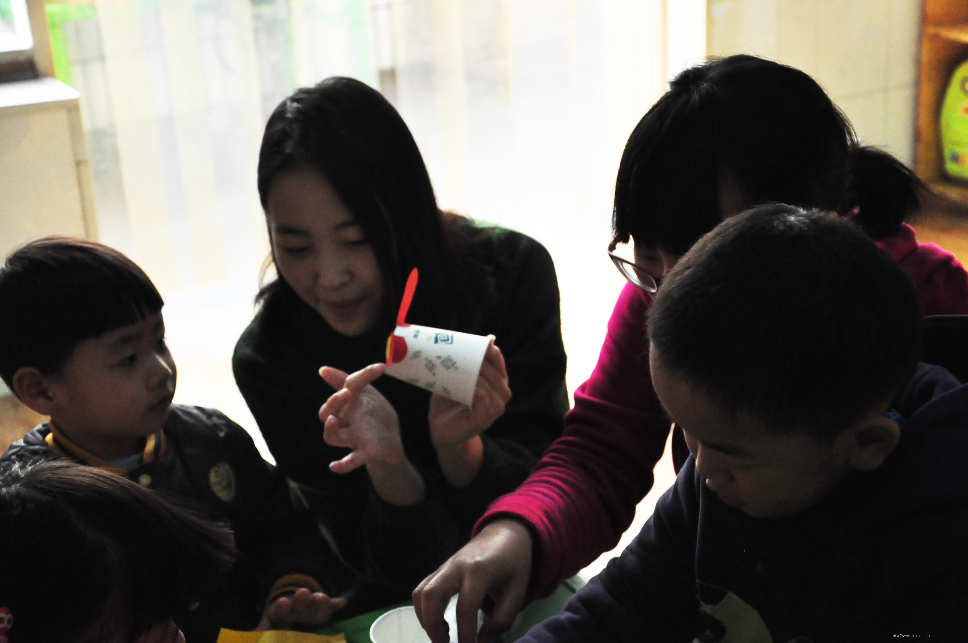 中韩志愿者混编组队担任幼儿园11个班的课外活动助教,与小朋友一起体验了丰富多彩的幼儿互动游戏。乒乓球投篮、虚拟菜市场、做纸杯小动物、给卡通人物涂色等活动形式多样、有趣。在制作纸杯兔的过程中,志愿者们只示范了一遍,大部分孩子已经可以完成,并且创意的为纸杯兔画上生动的眼睛和鼻子。韩国志愿者更是多才多艺,一边弹琴一边教给孩子们韩国童谣“三只小熊”“可爱歌”等,孩子们都咿咿呀呀的学唱起歌来,兴奋的手舞足蹈。一位来自法国的小朋友,还在活动之余给所有同学献上了一首《蓝精灵》,甜美的童声让在场的所有人都回忆起童年时期那熟悉优美的旋律……