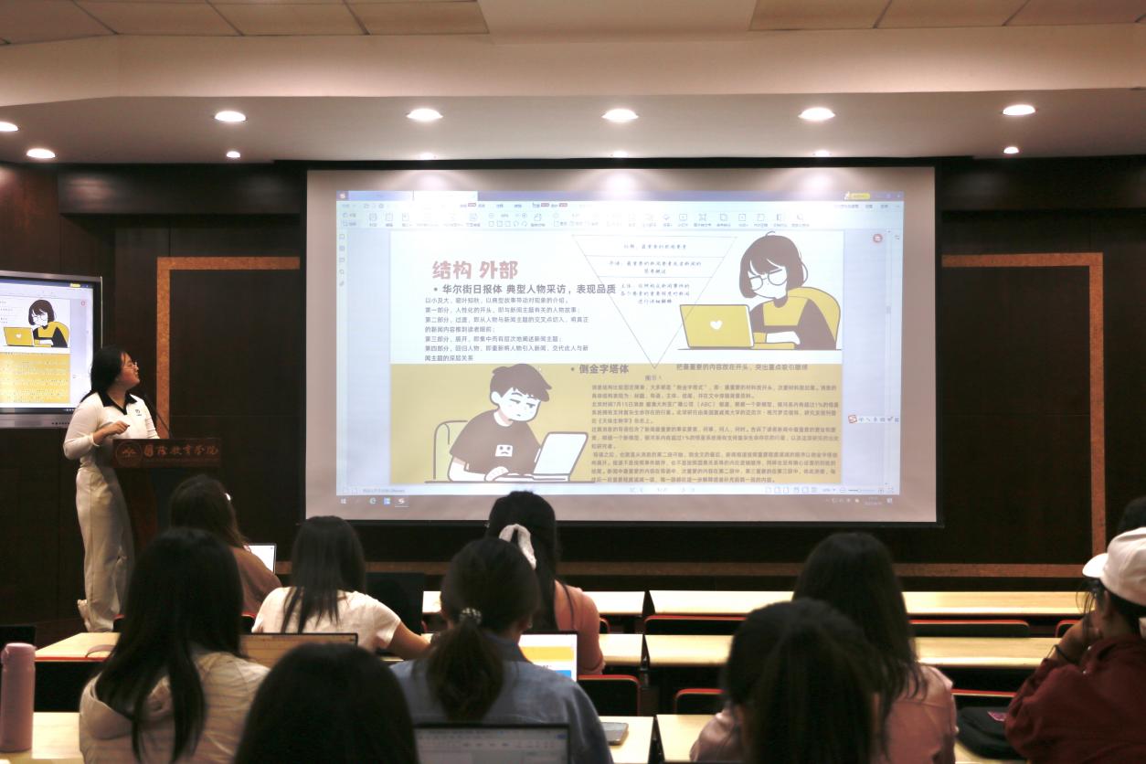 周丰硕详细介绍了新闻写作的外部结构和内部结构。在外部结构方面,她具体讲解了典型人物采访常用的“华尔街日报体”和最常见的“倒金字塔体”;在内部结构方面,她重点分享了新闻稿标题、导语、主体、背景、结尾等各个部分的写作要点及注意事项。