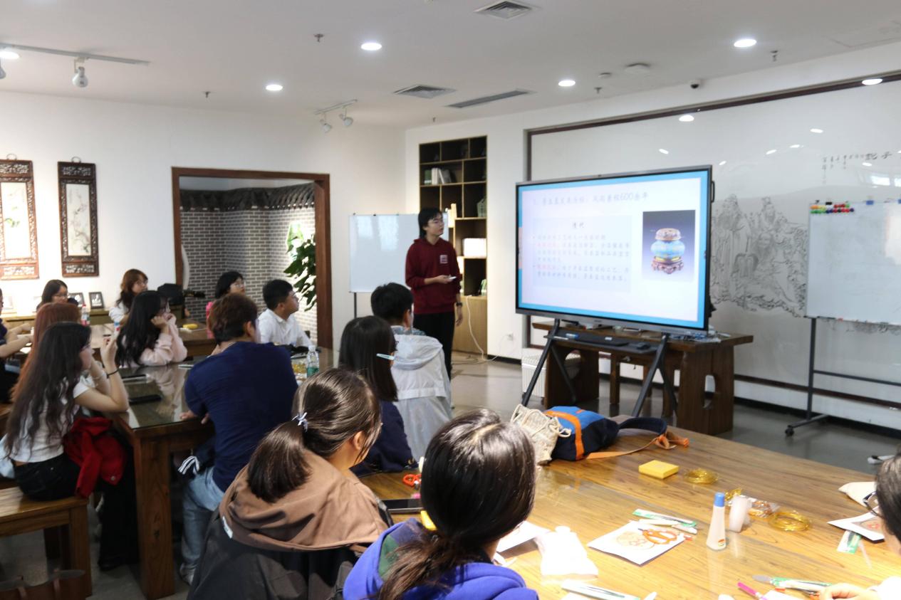 在节气文化导入后,讲解内容自然过渡至本次活动核心——掐丝珐琅传统技艺。主讲人通过播放专题短视频、分层次拆解等方式,清晰阐述该技艺的历史渊源、复杂制作工序,以及现代社会中的传承路径与创新应用方向,进一步激发新生对这门古老技艺的探索兴趣,为后续实践操作奠定扎实基础。